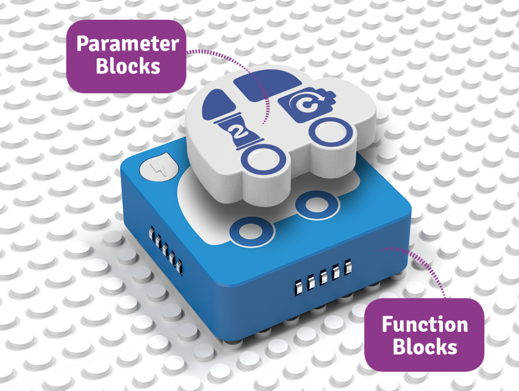 Sklapajući kockice Function & Parameter, dete stvara niz komandi koje će robot izvesti. Na primer, da se pomeri napred ili upali crveno svetlo.